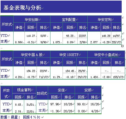 上周市场继续呈震荡走势。上证指数上涨0.01%,中标300指数下跌0.52%,深综指下跌0.98%。华安宏利今年以来净值增长名列97家股票型开放式基金的第14位,华安创新今年以来净值增长名列87家积极配置型基金第5名,华安宝利上周净值增长名列90家积极配置型基金第2名。