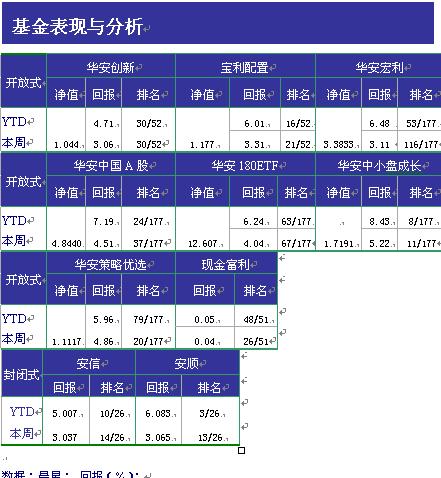 上周华安中小盘成长表现出色,在177只股票型开放式基金中排第11位,年初以来排名第8。基金安顺自年初以来,在26只大盘封闭式基金中排名第3。