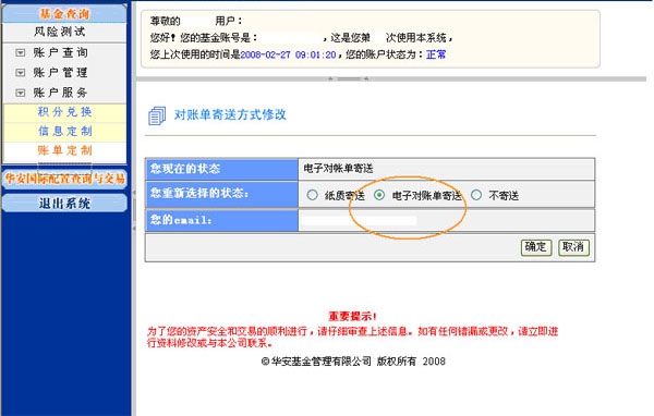您可通过华安公司网站个人账户交易/查询系统定制电子对账单服务,具体操作步骤如下: