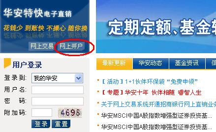 2、登录华安基金网站首页www.huaan.com.cn,在首页的左上方处点击"网上开户"