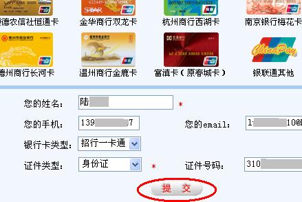 填写相关的个人信息,带"*"为必填项目;填写完毕后点击"提交";自动跳转至招行网银;