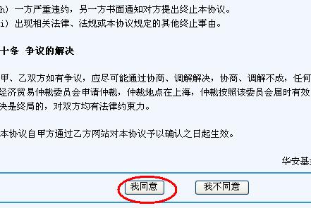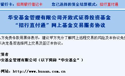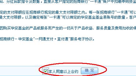 详细阅读"招商银行-华安基金直付通协议"后,选择"本人同意以上合约",并点击"确定";