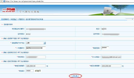 此时,协议已生成,在"招行个人银行大众版"中填写相关个人信息,填写完毕后点击"申请";
