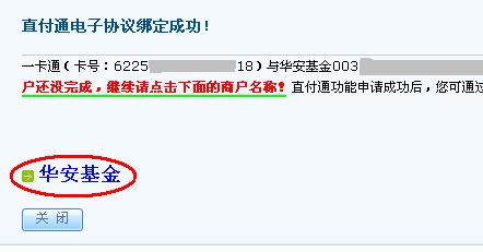 弹出窗口"直付通电子协议绑定成功!",点击"华安基金";自动跳转至华安基金网站;