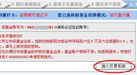 弹出"开户成功"窗口,显示基金帐号;账户初始密码为"证件号码后六位";点击"进入交易系统",即可进行"网上交易"。