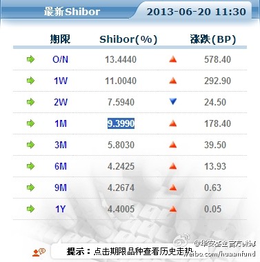 上海银行间同业拆放利率显示,6月20日,隔夜拆借利率大幅上升至13.44%,1月拆借利率上升至9.3990%。理财专家表示,Shibor一向都是是衡量货币基金和短期理财基金收益水平的风向标,即Shibor越高,货币和理财类基金收益就越给力。