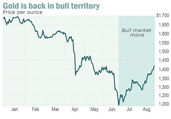 黄金价格相比6月晚些时候的近期低位每盎司1180美元已经有20%的涨幅,也就是说正式转入了牛市区域。不过也有分析指出,黄金价格的近期低位应该是6月28日时候伦敦黄金市场定价公司给出的每盎司1192美元的下午黄金结算价,以这个标准计算,黄金进入牛市的价格应该是每盎司1430.30美元。