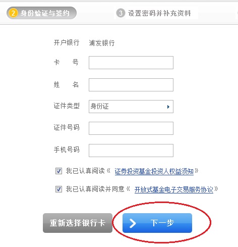 3. 进行“身份验证与签约”(您所输入的姓名、证件类型、证件号码、手机号码必须与您在浦发银行办理银行卡时所留的信息完全一致)、银行卡卡号,然后点击“下一步”按钮;