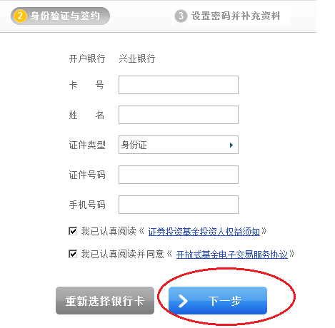3. 进行“身份验证与签约”(您所输入的姓名、证件类型、证件号码、手机号码必须与您在兴业银行办理银行卡时所留的信息完全一致)、银行卡卡号,然后点击“下一步”按钮;