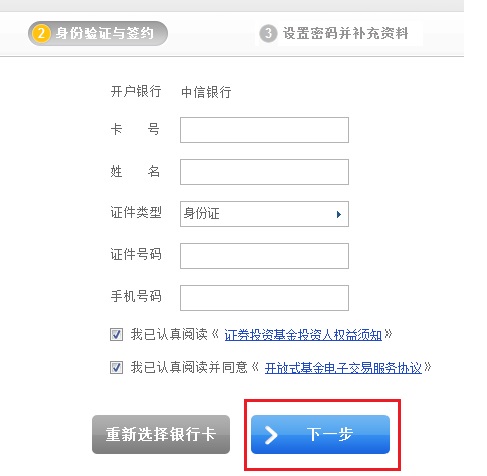3. 进行“身份验证与签约”(您所输入的姓名、证件类型、证件号码、手机号码必须与您在中信银行“柜台”办理银行卡时所留的信息完全一致)、银行卡卡号,然后点击“下一步”按钮;