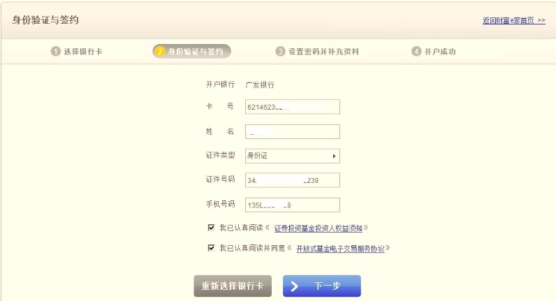 3. 进行“身份验证与签约”(您所输入的姓名、证件类型、证件号码、手机号码必须与您在广发银行办理银行卡时所留的信息完全一致)、银行卡卡号,然后点击“下一步”按钮;