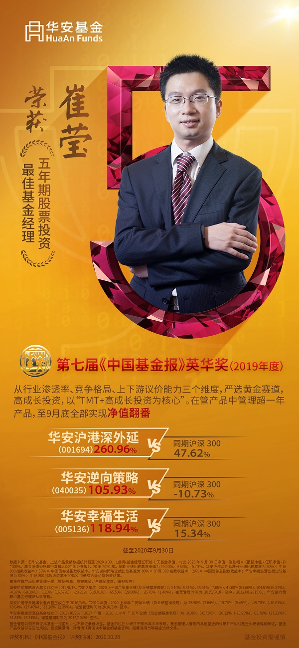 “英华奖”是国内基金行业聚焦投资人才的权威奖项,举办七届以来,已评选出一批经过市场检验,具备深厚研究功底、高超投资能力和良好职业操守的一流投资人才,为投资者选择优秀基金经理提供了有力参考。作为公募基金“老五家”之一,华安基金投研实力有目共睹,近年来更是出现了一批优秀的基金经理,此次荣获“英华奖”的胡宜斌、崔莹、李邦长就是其中的代表。