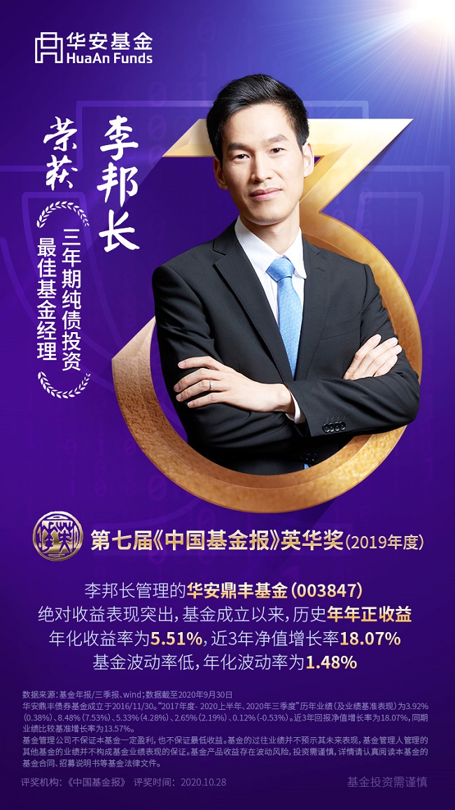 权益投资方面收获两项大奖,在固收投资领域,华安基金李邦长也荣获“三年期纯债投资最佳基金经理”奖。他拥有10年证券从业经验,投资风格稳中求进,且注重控制投资回撤和波动。基金三季报显示,截至9月30日,李邦长管理的华安鼎丰近3年收益率为18.07%,跑赢了业绩比较基准同期收益率。