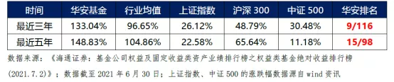 作为“老五家”公募之一,华安基金获各类奖项300多项,其中46次获得金牛奖,在权益类产品上表现出色。根据海通证券统计,截至2021年6月末,华安基金近三年主动权益收益排名全行业9/116,位列行业前十。