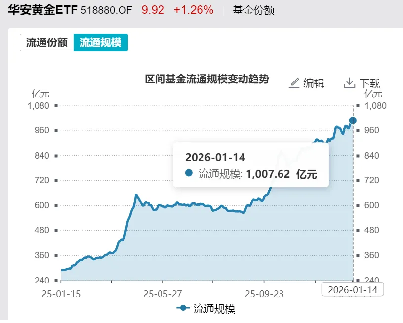 截至1月14日,华安黄金ETF最新份额达101.62亿份,规模迈上千亿元大关,达1007.62亿元,创下历史新高。